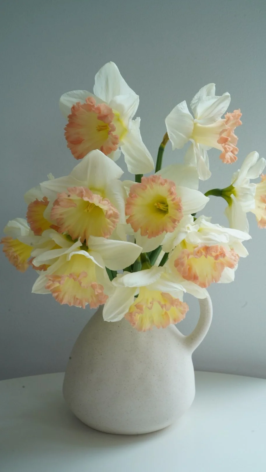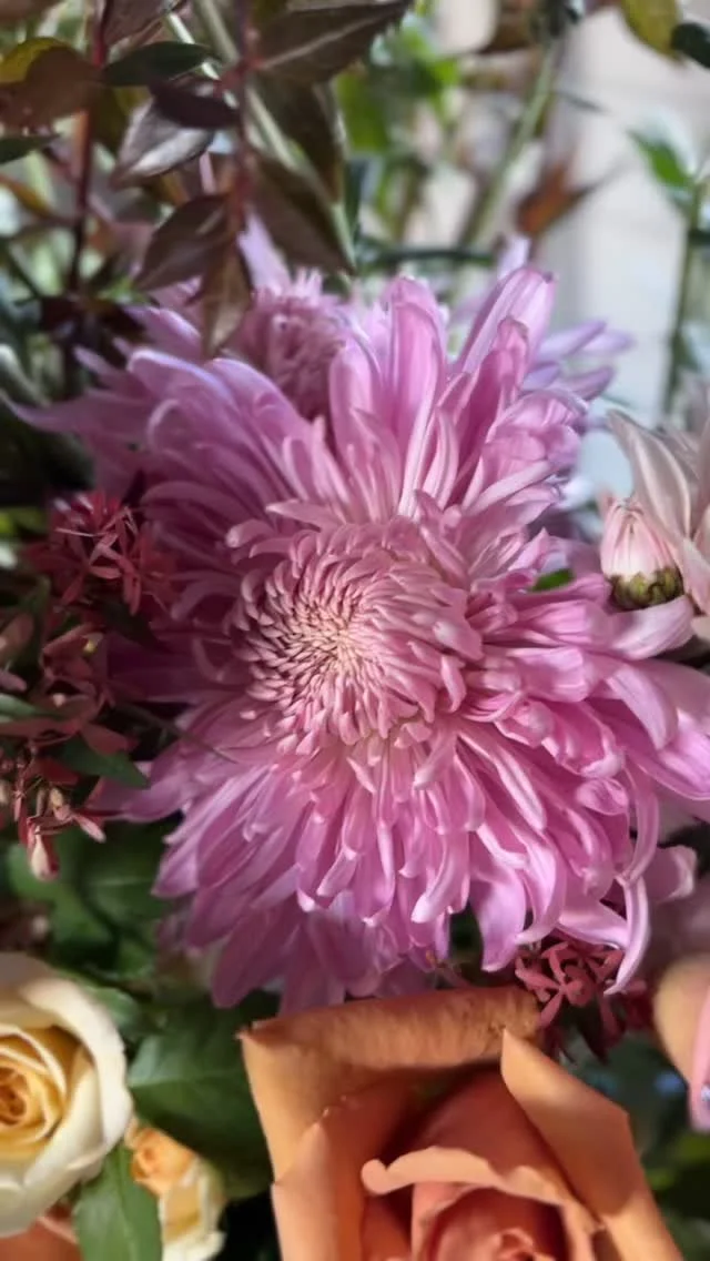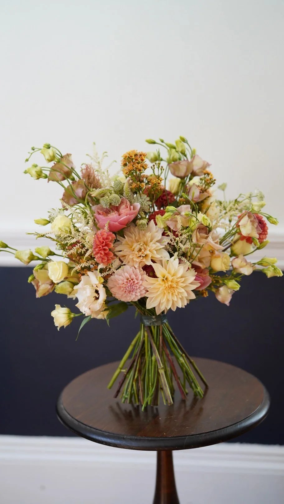 Our signature hand-tied bouquet is a lush, seasonal arrangement designed in our natural garden style. Each bouquet is wrapped in paper and prepared with a compostable water source so the flowers travel well and arrive fresh. The exact flowers change with the season, but every bouquet reflects the same thoughtful color palette and balanced design that define our work.